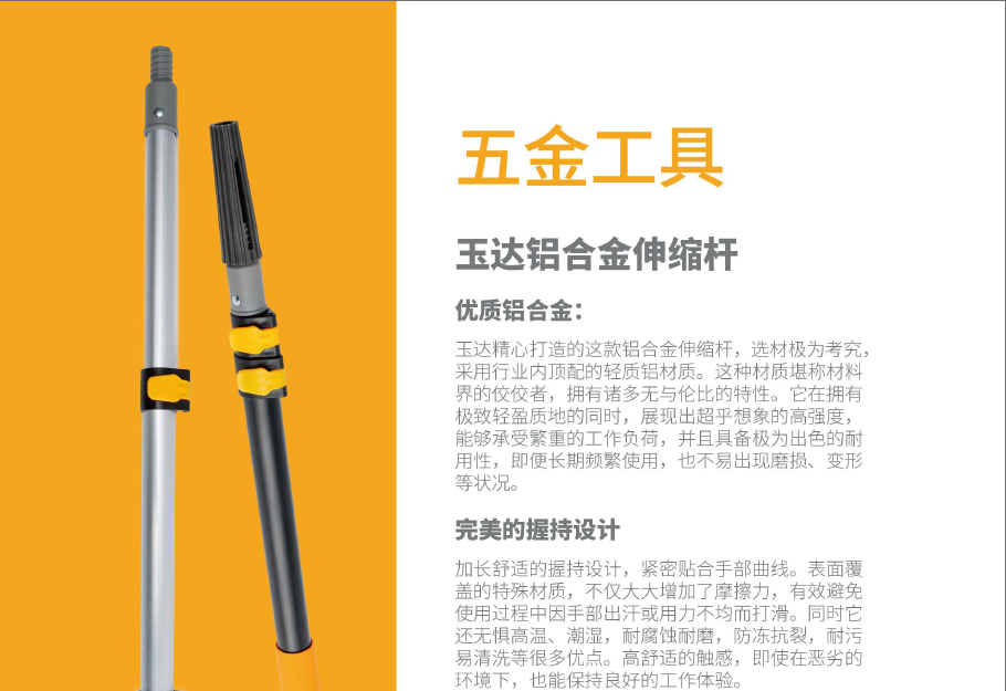 玉达精心打造的这款铝合金伸缩杆,选材极为考究,采用行业内顶配的轻质铝材质。