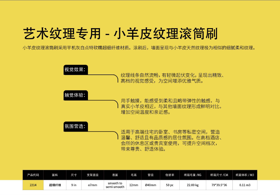 小羊皮纹理滚筒刷 采用平机灰白点特软糯超细纤维材质。涂刷后,墙面呈现与小羊皮天然纹理极为
